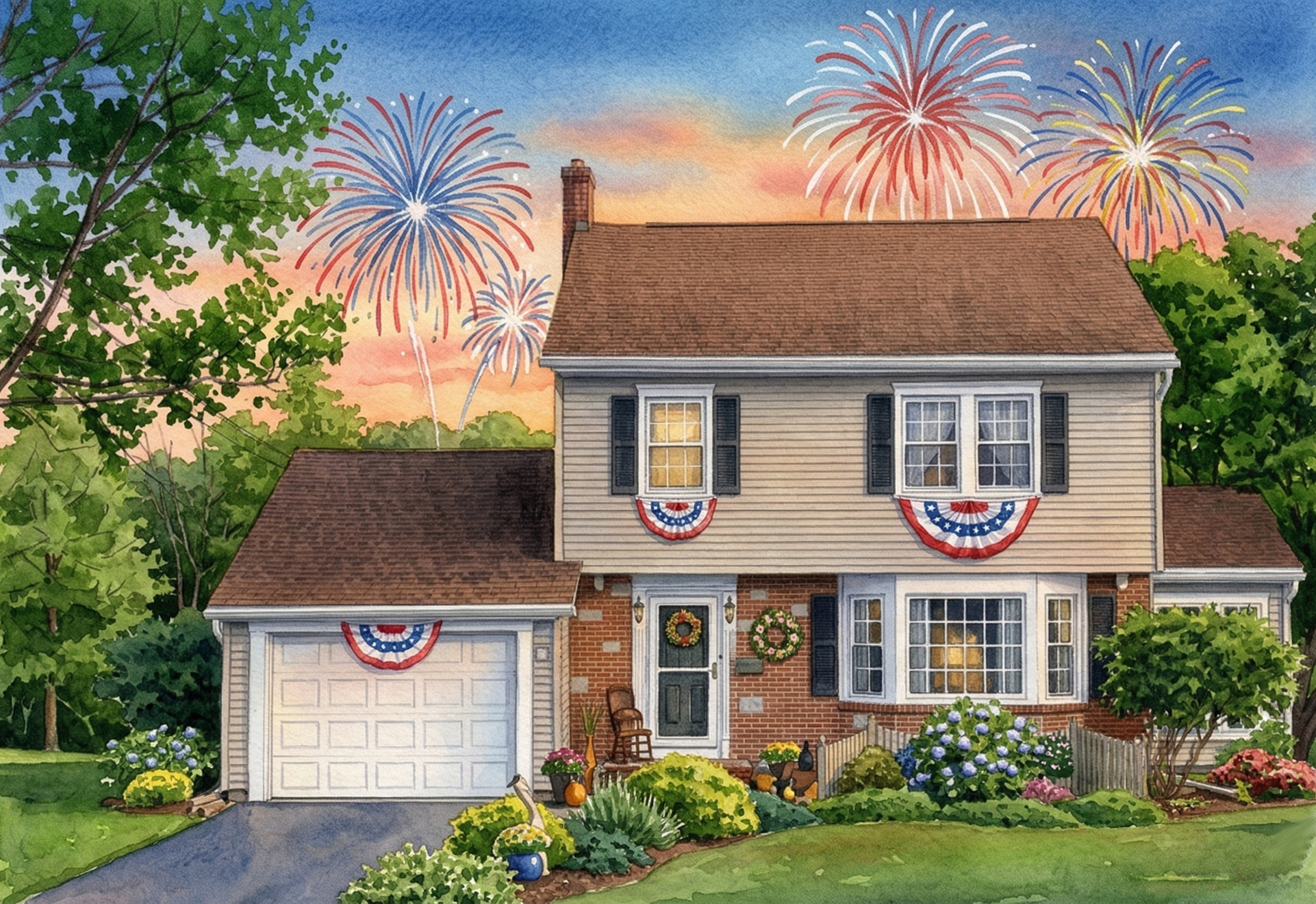 A patriotic celebration featuring vibrant red, white, and blue fireworks in a sunset sky, multiple large American flag banners on the porch, and festive garden planters.