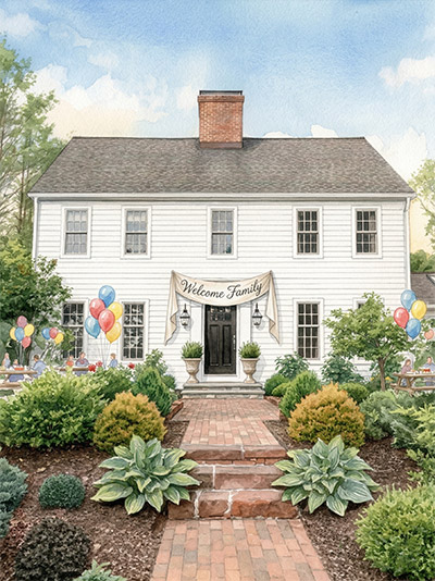 A scene of togetherness featuring a “Welcome Family” banner draped across the front, with a distant background hint of a lively backyard picnic and colorful balloons.