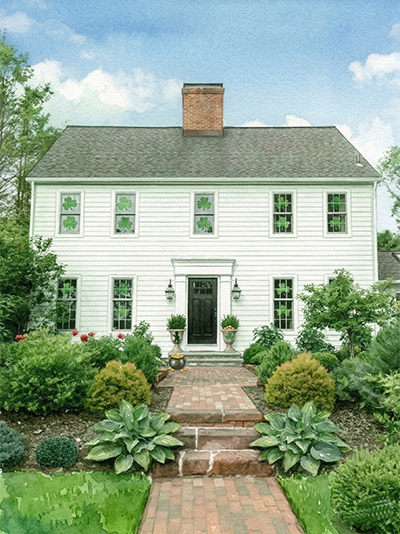 A “lucky” green-tinted scene featuring shamrock window decorations, a rain-refreshed lawn, and a small decorative pot-of-gold or leprechaun silhouette at the doorstep.