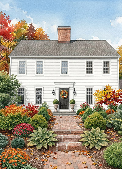 A vibrant scene of the home nestled among trees with deep orange, red, and gold leaves. Features a crisp, falling-leaf atmosphere and a rustic front-door wreath made of gourds and harvest foliage.